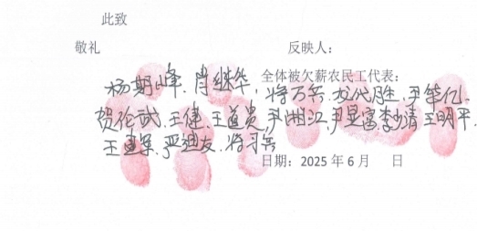 我们100多个农民工家庭正处在水深火热之中,孩子们等着学费,老人们等着医药费,整个家庭等着生活费。在多次维权无果的情况下,我们只能恳请中央领导为我们做主,救救我们这些为城市建设付出汗水的农民工家庭!