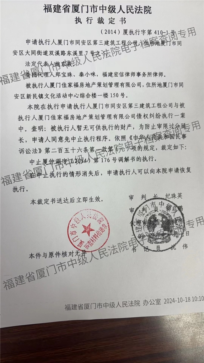 厦仲调字(2014)第 176 号仲裁案申请人是同安三建,林志中、林进福并非案件当事人,且该执行案件已于 2018 年终结。"我们连仲裁当事人都不是,凭什么扣我们的钱?" 林进福提供的(2014)厦执行字第 410 号之二裁定书清晰显示,该执行案件因 "被执行人无财产可供执行" 已终结。